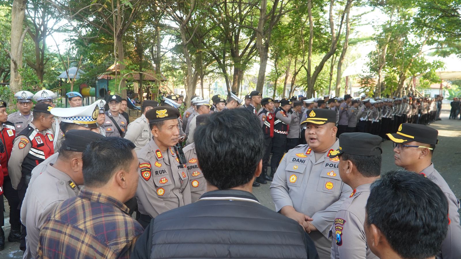 Apel pengamanan berlangsung di Bangkodir, Jl. R.A. Kartini, Bangil, dipimpin langsung Kapolres Pasuruan, AKBP Jazuli Dani Iriawan, S.I.K., M.Tr.Opsla.